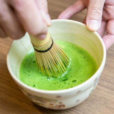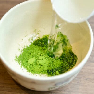 抹茶の点て方1 抹茶は約1.5g、お湯は70〜80℃ 抹茶を茶杓で2〜3杯(約1.5g)入れ、70〜80℃のお湯を少量注ぎ、茶筅で溶くように混ぜる。ちなみに、抹茶の材料となる茶葉は、玉露と同じように摘採前の一定期間に茶園を覆って育てる碾茶(てんちゃ)