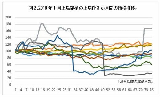 次に2018年度について見てみましょう。図2では1月に新規上場した全ての銘柄について上場後3カ月間の値動きを示しています(上場日の価格を100としています)。