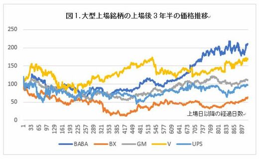 実は、2年ほど前、私は当時の新規上場において大型案件だったアリババ(日本の証券コードにあたる米国のティッカーコード:BABA)、ブラックストーン(BX)、ゼネラル・モーターズ(GM)、ビザ(V)とUPS(UPS)について、上場後の価格の推移を調べてみました。