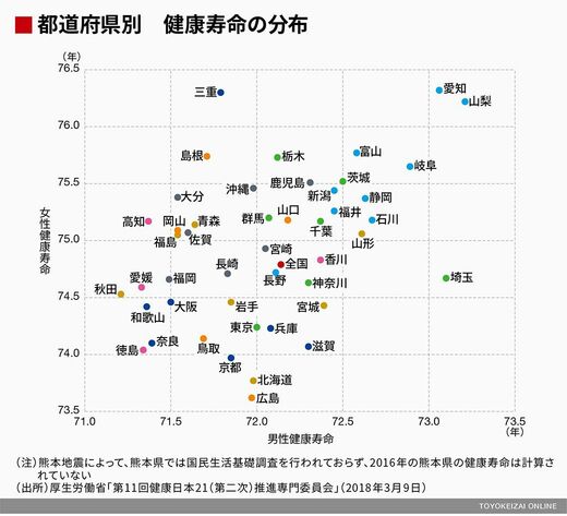 都道府県差をみると、男性の健康寿命が最も長い山梨県と最も短い秋田県の差は2.00年、女性の健康寿命が最も長い愛知県と最も短い広島県の差は2.70年となっています。