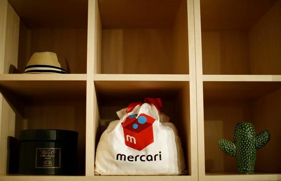 6月19日、東証マザーズに上場したメルカリは公開価格3000円を66%上回る5000円で初値を付けた。初値ベースの時価総額は約6760億円となり、今年最大の新規株式公開(IPO)となった。写真は棚に飾られているメルカリのロゴの入った袋。15日に東京のメルカリ本社で撮影(2018年 ロイター/Issei Kato)