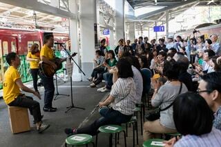 かくして、1往復目が終わって2往復目の出発まで約1時間。その時間を利用して、京急川崎駅ではちょっとしたイベントが行われた。キリンの社員スタッフによる、ビオラとギターの演奏会&クイズ大会。もちろん演奏の腕前は確かなのだけれども、言ってみればプロが演奏するわけでもないからある種の“宴会芸”だ。でも、ビール×通勤電車という非日常に放り込まれた参加者たちは、みな全力で楽しんでいた。キリンのCMの定番曲である「ボラーレ」や「茶色の小瓶」を大合唱。まさしくたかがビール、されどビール、である。