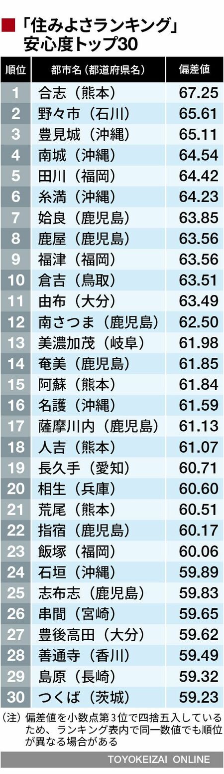 今回の指標の入れ替えによって、東京23区をはじめ、子どもの数が増加傾向にある市区が軒並み順位を上げる結果となった。とはいえ、「人口当たり病院・一般診療所病床数」「65歳以上人口当たり介護老人福祉施設・介護老人保健施設定員数」「15~49歳女性人口当たり出生数」の各指標では、いまだ地方に分があり、今年も西日本の地方都市がランキング上位に名を連ねた。そのなかでも目立つのが中国・四国、九州・沖縄の市で、トップ10に9市、トップ30に25市がランクインしている。