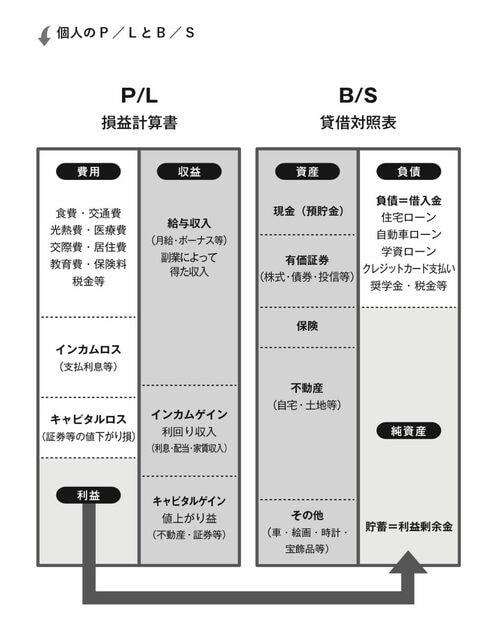 収益の部分には、通常、給与やボーナスが入ります。さらに、金利収入、配当収入、不動産収入などもここに入ってきます。これらはインカムゲインと言われるものです。それを生み出す株式や投資信託などの有価証券や不動産などは、B/S上に資産として記載されます。