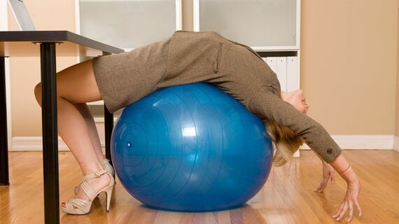 狭い通路で、ぐらんぐらんと揺れる女性のシルエット。東京都内のメディア関連企業に勤務するY子さんの職場では、同僚のA美さんがバランスボールに乗ってデスク作業をする姿を皆がヒヤヒヤしながら見守っている。