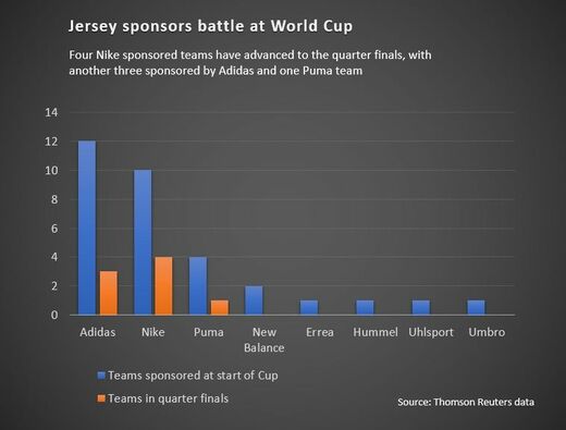 ナイキのスウッシュのマークは、ベスト8の組み合わせの一方のサイドにいる、ブラジル、フランス、イングランドのユニフォームを飾っている。これらのチームは、ワールドカップの優勝チームを賭けるウェブサイトで人気上位を占めるチームだ。さらに反対サイドのクロアチアもナイキである。