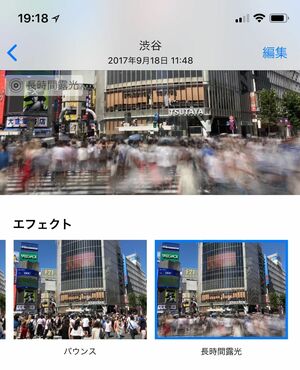 また、長時間露光は、街の風景を撮ったときに便利。建物などの風景はそのまま写るが、動きのある人だけがブレた状態で表示される。プライバシーに配慮して、1人1人にボカしをかけるよりも、Live Photosを長時間露光にしてしまう方が手っ取り早い。ダイナミックな動きを静止画で表現できるのも、この効果の魅力といえるだろう。