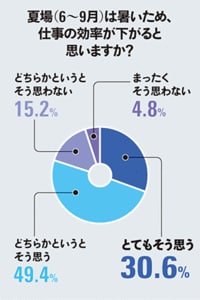 だが、この暑さだ。調査会社のマーシュが行ったアンケートによれば「夏は暑くて仕事の効率が下がると思うか」という問いに対して、「とてもそう思う」または「どちらかというとそう思う」と答えた人は、あわせて80%もいた。