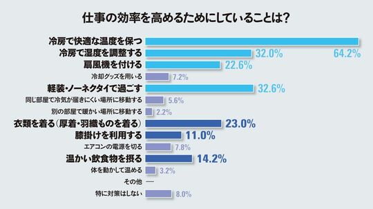 仕事の効率を高める工夫についても聞いたところ「冷房で快適な温度を保つ」が大多数で、「冷房で湿度を調整する」「扇風機を付ける」「軽装・ノーネクタイで過ごす」という回答も多く見られた。こうした「涼」を求める人がいる一方で、「衣類を着る」「膝掛けを利用する」「温かい飲食物を摂る」といった「暖」を求める人も多くいた。