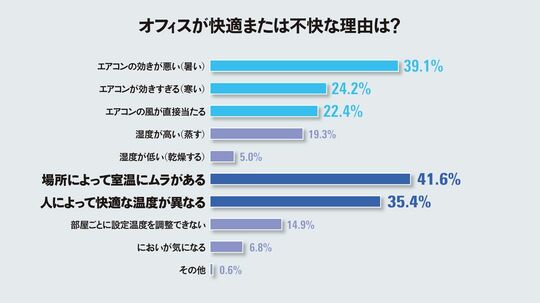 不快に感じる理由については「エアコンの効きが悪い」「エアコンが効きすぎる」「エアコンの風が直接当たる」などエアコンに対する不満が多く、しかも“暑い”、逆に“寒い”と感じる両者の声があることがわかった。「場所によって室温にムラがある」や「人によって快適な温度が異なる」と回答する人も多数いた。