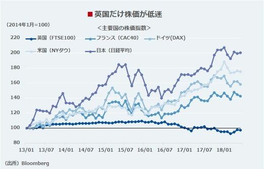 金融市場に目をやれば、英ポンドはBOE(イングランド銀行)に対する利上げ観測がドライバーになりやすいが、英国株はブレグジットの話題がやはり懸念されているような印象である。基本方針発表後のFTSE100は大崩れせずに堅調だったが、過去5年の動きを見た場合、英国株が他の主要国株に劣後しているのは間違いない。実体経済の先行きを映す株価は「合意なしの離脱(クリフエッジ)」まで見越しているのだろうか。