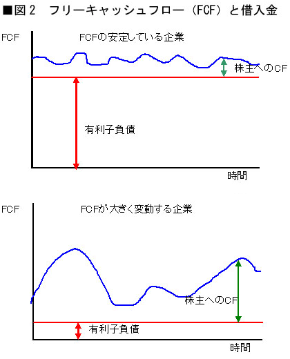 このことは、企業がどこまでお金を借りられるかは、その企業が生み出すフリーキャッシュフローのバラつき具合によって規定されることを示している(図2)。