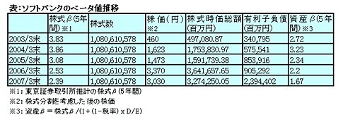 注目すべきは、これに伴ってソフトバンクが保有する資産の中身も大きく変化してきたことである。βの時系列での推移を見ても、リスクの極めて高いベンチャー投資事業から、リスクの低い移動体通信事業(例えばNTTドコモの株式βは0.66(*1)と、かなり低い)へと、ソフトバンクの事業ポートフォリオは、時代とともにリスクが低減する方向に進んできたことわかる。