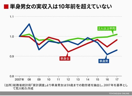 まず、実収入ですが、2007年基準で比較すると、二人以上世帯が全体的にゆるやかに上昇して2017年時点では基準を超えているのに対し、単身世帯は男女とも2009年以降一度も基準を超えたことがありません。全体的に右肩下がり基調です。特に、単身男性は2014年にやや盛り返したものの、また下降して、2016年には10%近くも減少しています。