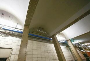 丸ノ内線のホームへ行き、天井を観察すると、銀座線の上野駅や虎ノ門駅などで見られる、リベットを使用したイボイボの鉄骨が残っているのだ。