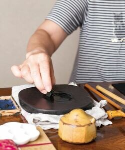 絵手紙は、輪郭線を墨で描きます。そのため、はじめに硯で墨をすります。墨の濃度は半紙などに線を描いてみて、決めます。