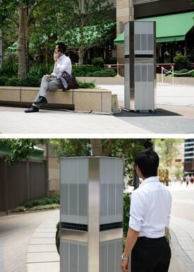 そんな東京に、7月23日〜25日までの期間限定で猛暑の屋外でもくつろげる希有なスポットが誕生した。場所は、東京ミッドタウン日比谷。その1階にあるカフェの前のテラスに、人の背丈くらいのものが置かれ、側面からカラッと乾いた冷風が吹き出ている。そう、ほかではなかなかお目にかかれない「屋外用エアコン」だ。世界的空調メーカー、ダイキンが開発した試作品である。