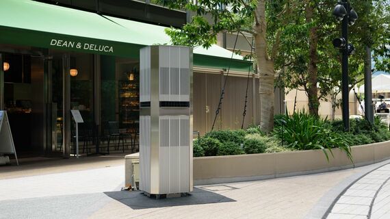 この屋外用エアコンは、室内機と室外機が一体となったタワー型エアコンだ。縦長のボックス型で、高さは170センチで大人の背丈ほど。4つの側面から強力な冷風を吹き出し、周囲の半径約3メートルのエリアを涼しくて快適な空間に変える。吸い込んだ空気から取り除いた熱は、天井面から上方向へ排出されるという。