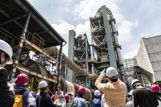 セメント製品製造の中で“焼成工程”を担うNo.3キルン・プレヒータと工場内で使用する電力すべてを賄うバイオマス発電施設の2カ所が見学ポイントだ。特に1つ目の見学ポイントは約1450度に熱せられた原料が巨大なパイプを通る工程というだけあって、見学場所も40度をはるかに超える灼熱の世界……。