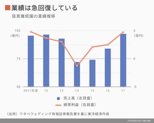 婚礼やレストランの改革効果と相まって、経常赤字に陥った2014年度に71.9億円だった売上高は2017年度に96.9億円へ増加し、4.7億円の経常利益を計上した。婚礼プロデュース事業を手掛ける子会社のクレッシェンドプロデュースを今年4月に吸収合併したこともあり「2018年度は売上高120億円を目指したい」(本中野氏)。