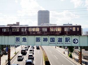 今津南線にある唯一の中間駅が阪神国道駅だ。ここでいう「阪神国道」は大阪と神戸を結ぶ国道2号線を指す。かつて、国道2号線には野田と東神戸を結んだ路面電車、阪神電車国道線があり、現在は阪神バスが走っている。阪神国道駅に最も近い阪神バスの停留所は「阪神国道駅前」だが、2009年3月まで長年にわたり「北今津」を名乗っていた。このように、バス停からも阪急、阪神の経営統合の影響が見られる。