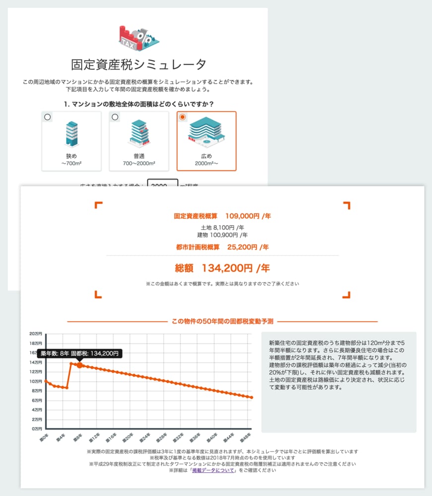 サービスの利用方法は非常にシンプル。気になるエリアのマンションのページで、敷地面積の目安や敷地に対する建物の割合、専有面積などの大まかな物件情報を入力するだけで土地・建物それぞれにかかる固定資産税、都市計画税の概算が出る。さらに、築後50年間の税額の変化を反映したグラフも出るため、数年後のコストはもちろん、所有している期間の総コストもイメージしやすい。