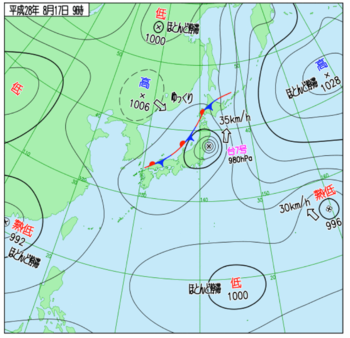 今回の西日本豪雨は極端な例ですが、毎年梅雨の末期は、梅雨前線に向かって暖かく湿った風が流れ込むため、大雨が発生しやすい傾向にあります。また、これからの季節は台風で同様に大雨が起こる可能性があります。特に、前線に台風が近づく場合は大雨に見舞われやすいです。予想天気図で下記のように前線と台風が現れている場合は要注意と覚えておきましょう。