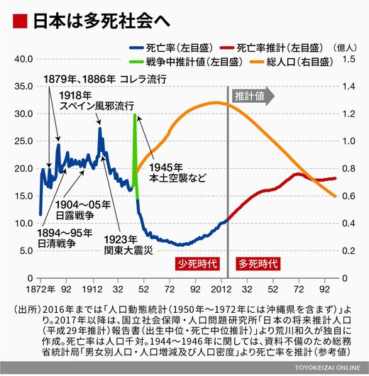 しかし、太平洋戦争後の1951年から2011年まで死亡率10.0未満が60年間も続いたこと自体がむしろ稀有だったとみるべきで、戦後の日本の人口増加というものは、ベビーブームだけではなく、「少死」によるものだったと言えるでしょう。