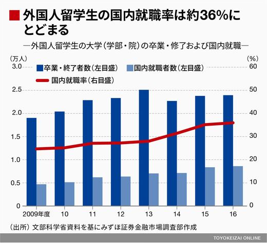 むろん、上記は大きな問題なのだが、そもそもこれまで政府が外国人労働者の受け入れ対象の中心としてきた「留学生・高度外国人材」の成果が限定的であるという事実のほうが問題だろう。日本で就職を希望する外国人留学生は全体の約64%にのぼるが(日本学生支援機構の調査)、2016年度の大学(学部・院)段階における外国人留学生の国内就職率の実績は36.0%にとどまる。