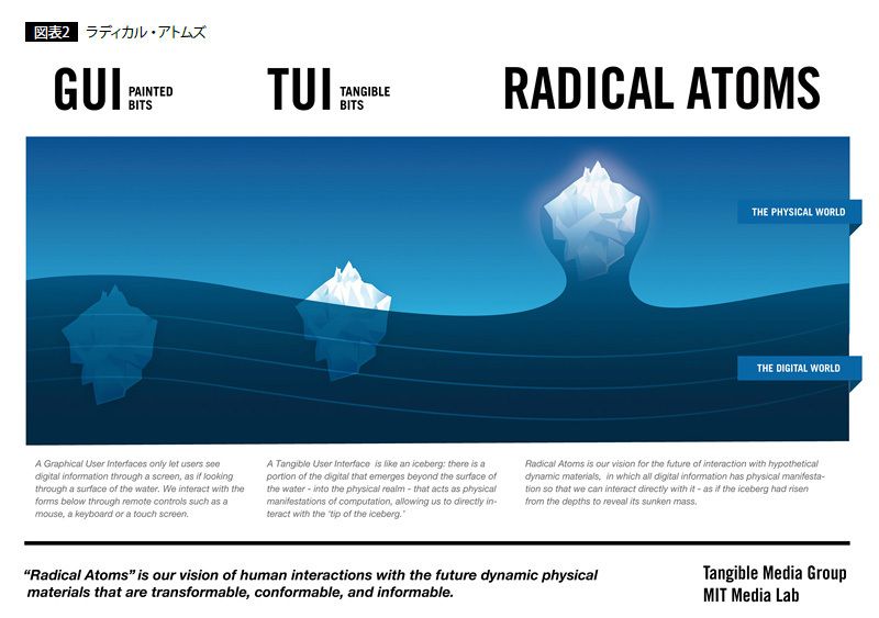 私はこれまで、どんな山を造り、登ってきたのか。私は、自分の人生のライフスパンを超えて、2200年の未来にまで残るようなビジョンを生み出すこと、それを次の世代に遺すことをずっと考えてきた。優れた技術も、優れた製品も、やがて陳腐化し消えてゆく。しかし、優れたビジョンは、強い普遍性を持つビジョンは、時代を超えて生き残る。私がこれまでMedia Labで大きなプレッシャーにさらされながら生み出した山、すなわちビジョンは、デジタル情報に直接手で触れて操作できるインターフェイス「タンジブル・ビット」、そしてダイナミックに形状や性質を変化させられる新しい物質「ラディカル・アトムズ」である。未踏峰連山を造山しながら、その世界初登頂を私はめざしている。