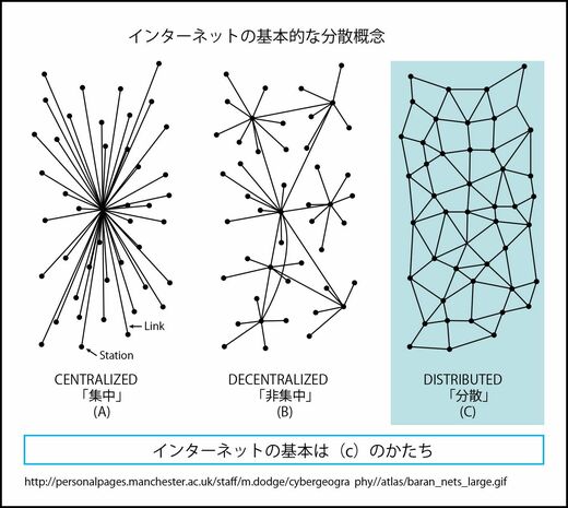 インターネットは、世界を一新しました。インターネットは、分散型です。ネットワークに接続された各ノードは完全分散型で、どこにも集中局がありません。インターネットが登場する前の電話交換網や大型コンピュータのオンラインネットワークなどは、必ず集中局があり、集中局が全体や部分を管理統括する役割を担っていました。