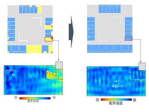 同社のシステムでは、建物の設計図や配線図現地調査に基づき電波の動きをシミュレーションし、繋がりやすさを青、黄、赤の順で表示する。実際に埼玉医科大学国際医療センターの病棟で行った実験では、一部の病室が黄色に、扉で仕切られた空間であるトイレの中が赤く表示された。