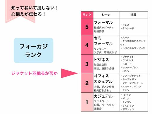 そんなみなみが働く女性のために提唱する装いのルールとは、とてもシンプルであるがゆえに共感を得る。水平方向には「4つの性格タイプ」、そして垂直方向に「フォーカジランク」。性格によって似合うファッションのテイストをフェミニン・キュート・シャープ・ナチュラルと4分類し、そのテイストの中でカジュアルからフォーマルまでの5段階の格付けをして、今日必要な装いはそのランクのどこに位置するかを考える。