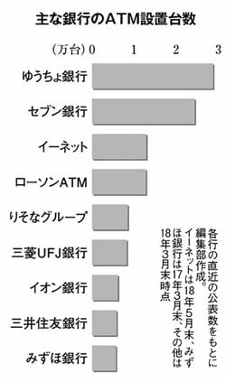 セブン銀行は、セブン-イレブンやイトーヨーカドーなど全国各地の店舗に2万4千台余りのATMを設置。ATM網の厚みは、ゆうちょ銀行に迫る。顧客は店舗で買い物するついでに、お金をおろせる。