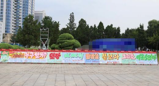 広場にある手描きのプロパガンダパネルには、多くのメッセージが書き出されている。