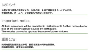 その後、英語と中国語による告知が追加されたが、7日朝10時時点ではまだ更新されていない。この点についてあらためて問い合わせたところ、JR北海道広報は「停電は復旧したが、まだ情報収集ができておらず、ホームページの更新まで手が回らない」とのことだった。だが、「ホームページも再開できるよう、急いで準備を進めている。午後には再開できれば」としている。
