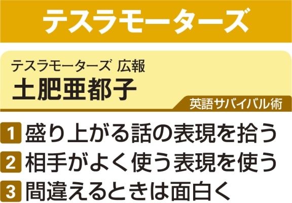 取材のセッティングや英語プレスリリース作成、電話会議。米電気自動車ベンチャー、テスラモーターズの広報、土肥亜都子さんの毎日は忙しい。米本社との業務連絡も多く、メールや電話など日々の業務の大半は英語で行う。