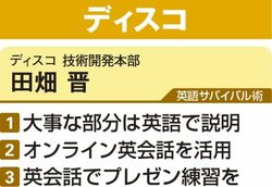 社内で定期的に開催されるネイティブによるマンツーマンの英会話レッスンにも参加している。講師が元社員で田畑さんの業務内容にも精通しているため、レッスンでは装置の説明を顧客にするという設定で英語を学ぶ。資料を使ってプレゼンの練習をすることもある。