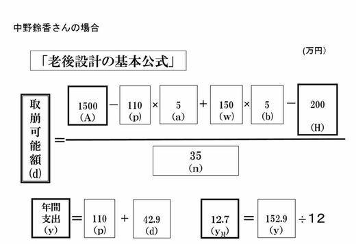 実際に計算する必要はありませんので、式を眺めながら、読み進めてください。まずは老後設計の基本公式は以下です。そこに鈴香さんの考えている数字を入れていきます。