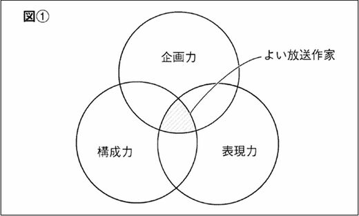ちなみに、私の考える「よい放送作家の条件」とは「企画力」「構成力」「表現力」を、バランスよく兼ね備えていることです。これも、言葉でどうこう言うより、次のような図①にしたほうが伝わります。