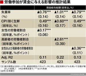 推計結果によると「女性や高齢者の労働者割合の上昇は、有意に現金給与総額の伸び率を押し下げる」という。