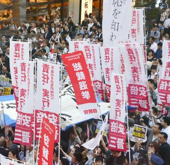 午後5時の秋葉原駅前では、白地に赤字で「責任、実行 平成のその先の時代へ」と書かれた巨大な幟(のぼり)や日の丸がはためいた。