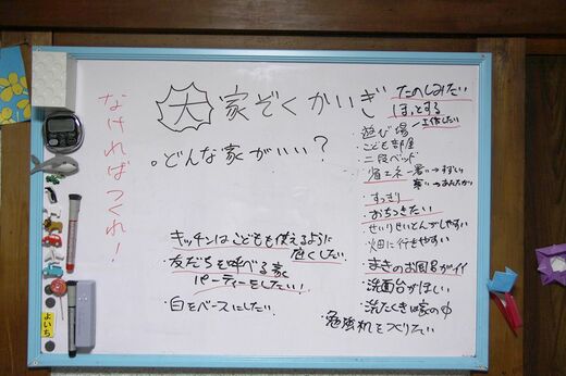 当時の写真を見せてもらうと、大きなホワイトボードにこう書いてある。「大家族会議 なければつくれ! どんな家がいい?」