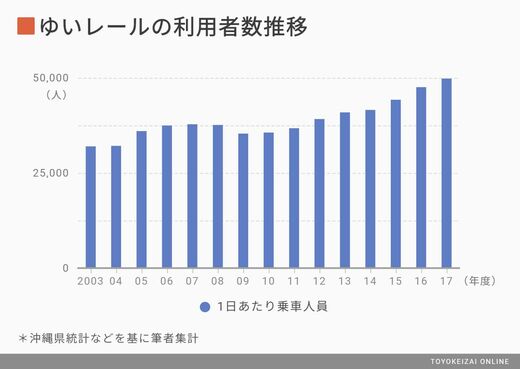 2003年に開業したゆいレールは開業時に1日あたり約3万1000人の利用を見込んでいた。開業した2003年8月こそ1日平均約4万6000人になったものの、ひととおり「お試し乗車」が済むと翌年1月には1日平均約2万7000人にまで利用客が落ち込んでしまう。