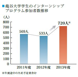 龍谷大学はキャリア形成支援において、学生と社会との接点づくりを重視する。インターンシップでは、短期就業体験型、大学独自の協定先企業で実施する協定型、海外型、長期プロジェクト型、学部の専門性を生かして実施するアカデミック型の5種類を提供し、今年度は700人以上の学生が参加している。