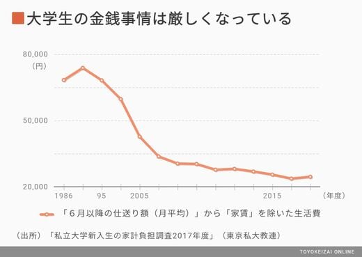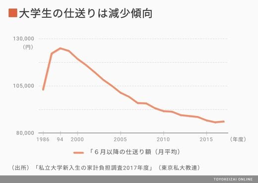 「東京私大教連」が出している「私立大学新入生の家計負担調査2017年度」を見ると、仕送りの額も右肩下がりだ。入学前後の出費が落ち着いた6月以降の仕送り額を月平均で見ると、1994年度にピークをつけた12万4900円から、2017年度は8万6100円まで急落している。