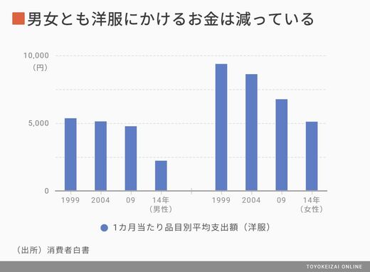 実際に、どれだけ若者がお金を使わなくなったかを見てみよう。消費者庁が発行している、「消費者白書」によれば、1カ月当たりの洋服にかけるお金は男性も女性も1999年以降、大きく下がっている。