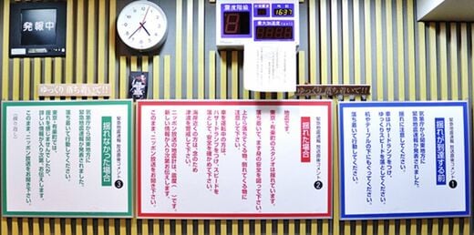 地震に限らず、たとえば有事の際なども同様ですが、その瞬間に最も大切なのは、アナウンサーが冷静に状況を伝えること。そのため、各スタジオの壁には緊急地震速報を受けた際に読み上げるコメントを掲示しています。まずは落ち着いて行動するようにリスナーへ呼びかけ、さらにスタジオ自体が「揺れた場合」と「揺れなかった場合」それぞれのケースに合わせたコメントを読み上げます。