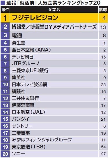 総合第1位はフジテレビジョンとなった。昨年は4位と順位を下げたが、2年ぶりに首位に返り咲いた。それぞれで満遍なく高い得票(男子3位、女子2位、文系1位、理系4位)を得ての1位である。総合2位は、博報堂/博報堂DYメディアパートナーズ(以下、博報堂)で、昨年13位から一気に順位を上げ、本調査開始以来、初めて電通を上回る結果となった。その電通も昨年8位からランクアップして総合3位。結果として、トップ3はマスコミ・広告の独占となった。ほかにも、テレビ朝日が6位、集英社が昨年と同じく9位、日本テレビ放送網が10位と、トップ10に6社が顔を並べた。昨年は3社だったことを考えれば、今年はマスコミ人気が復活したといっていい。