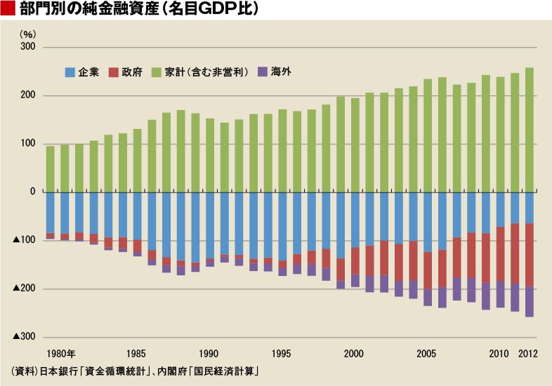 しかし、1990年代末になると企業は貯蓄・投資バランスが黒字を出して急速に債務の圧縮を行うようになり、2012年度にはバブル前を大きく下回る60%台前半にまで低下している。